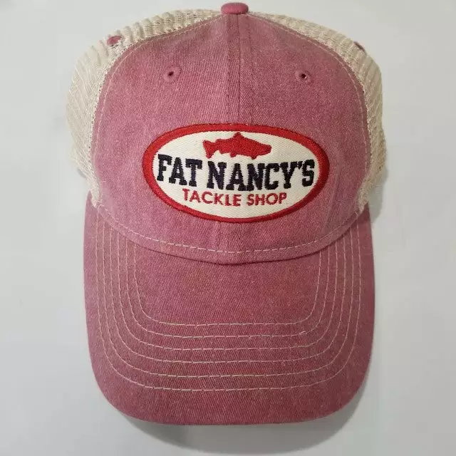 Fishing baseball hat with Fat Nancy’s Tackle Shop and salmon silhouette on the front Available in light maroon with a mess back. Adjustable strap for sizing.