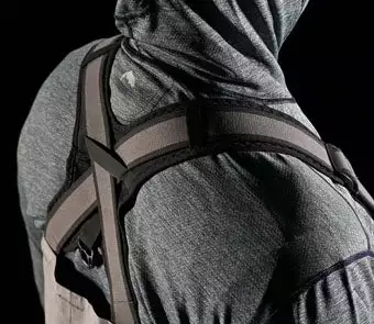 - Adjustable spacer air-mesh suspender system with opposing Duraflex buckles for waist-high conversion, now with a fabric suspender divider