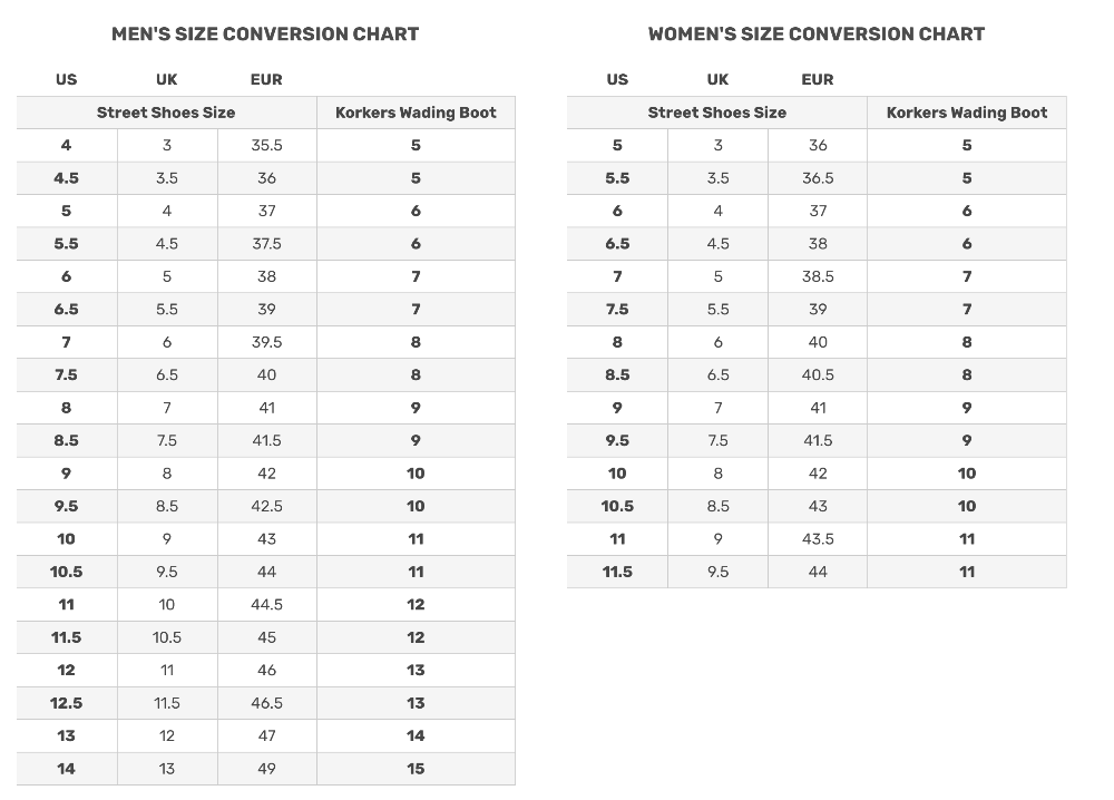 Due to variations in fit and thickness of different neoprene stocking foot socks, we recommend you use the sizing guide below to help guide your purchasing decision. Find your standard street shoe size on the left hand side of the chart and order the corresponding Korkers wading boot in the right hand column. Please try your product on to ensure the proper fit prior to use in the field.