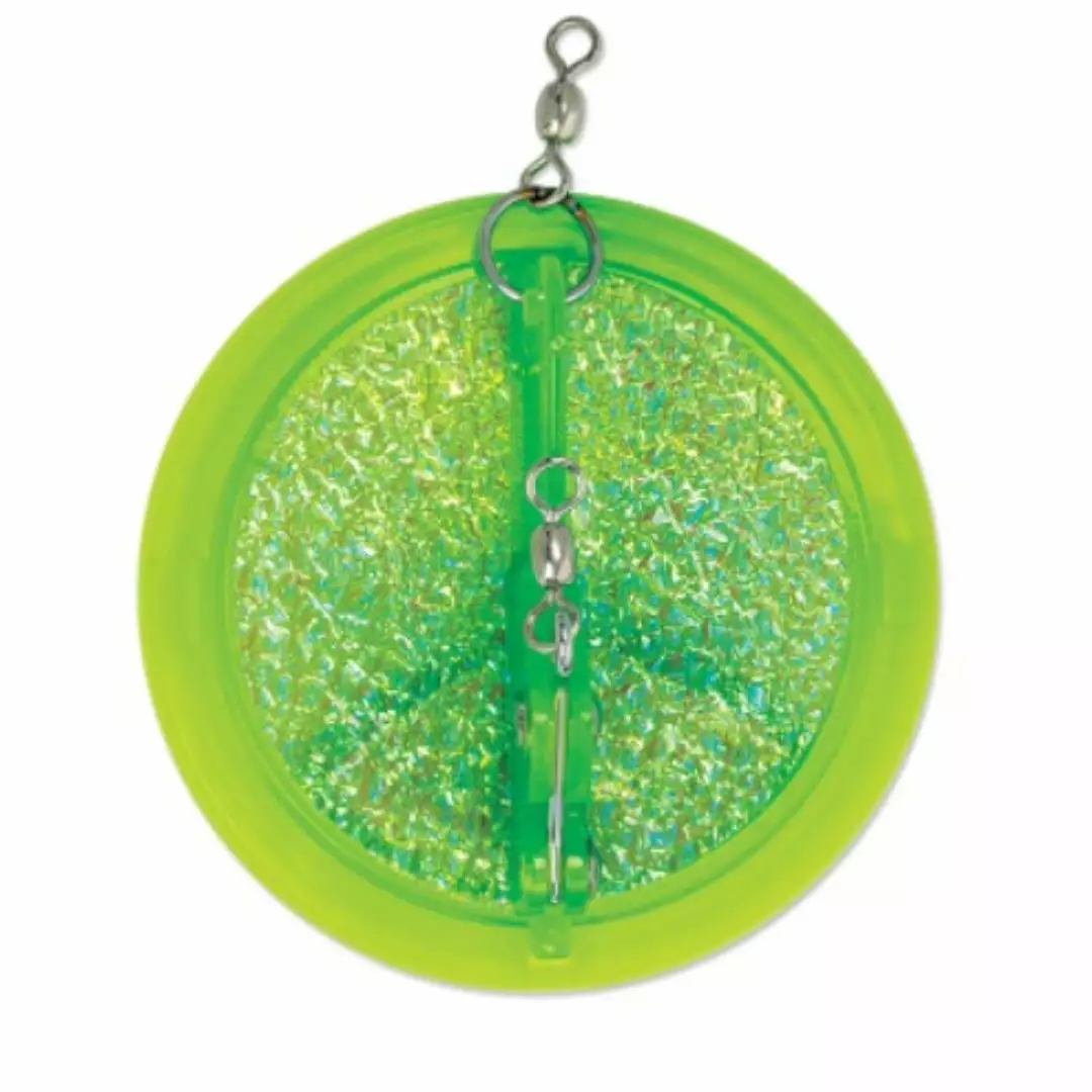 The special round shape and resulting multi-directional feature sets the Dipsy Diver® apart from all other divers and planers. A shift left or right, as indicated on the base plate, will cause the diver to track to port or starboard, allowing for large spreads of lures to be fished from a single boat. You’ll cover more water when the Dipsy Divers are deployed. The adjustable trip mechanism can be set specifically for various lure sizes and the size of target fish. Four sizes of Dipsy Divers are available, with dive depths of up to 20, 35, 50 and 100 feet. See our Tech Report: Dipsy Diver, The Directional Diver and Tech Report #15: Trolling Spoons for Freshwater Salmon, Striped Bass, Trout.
