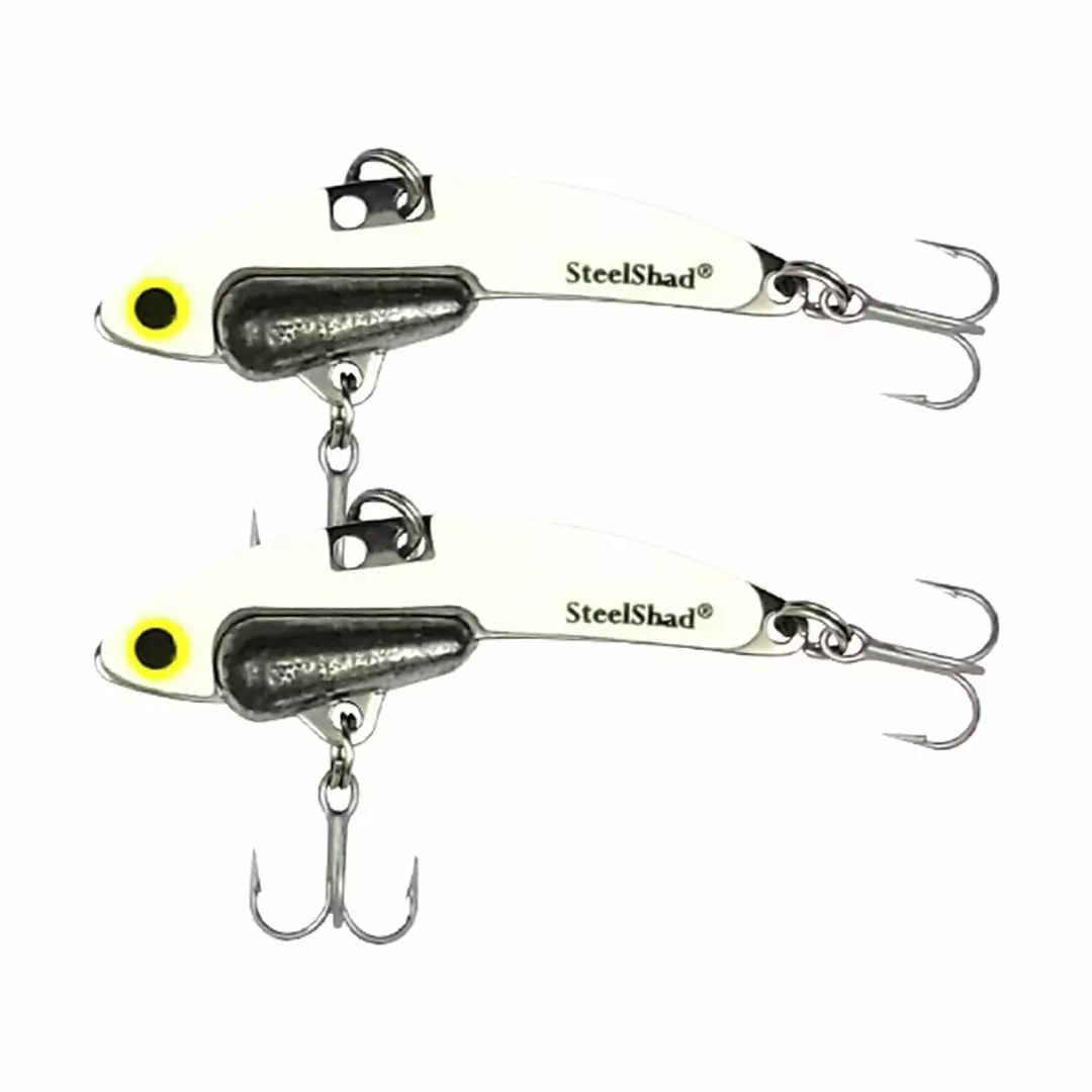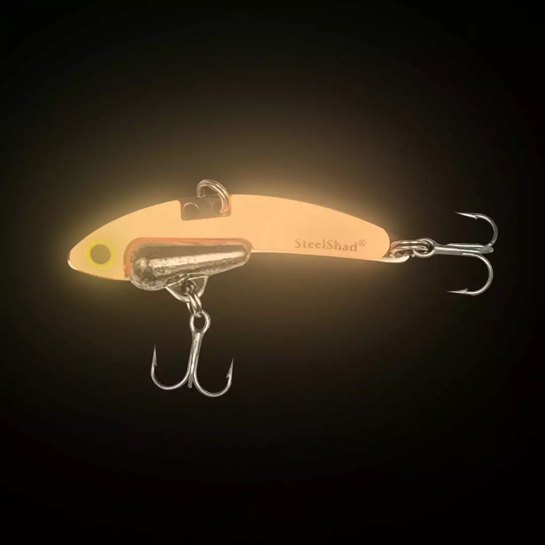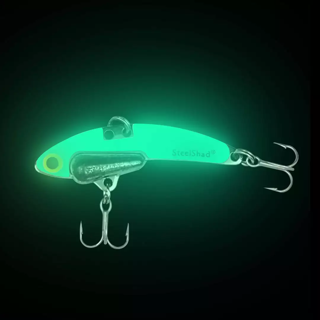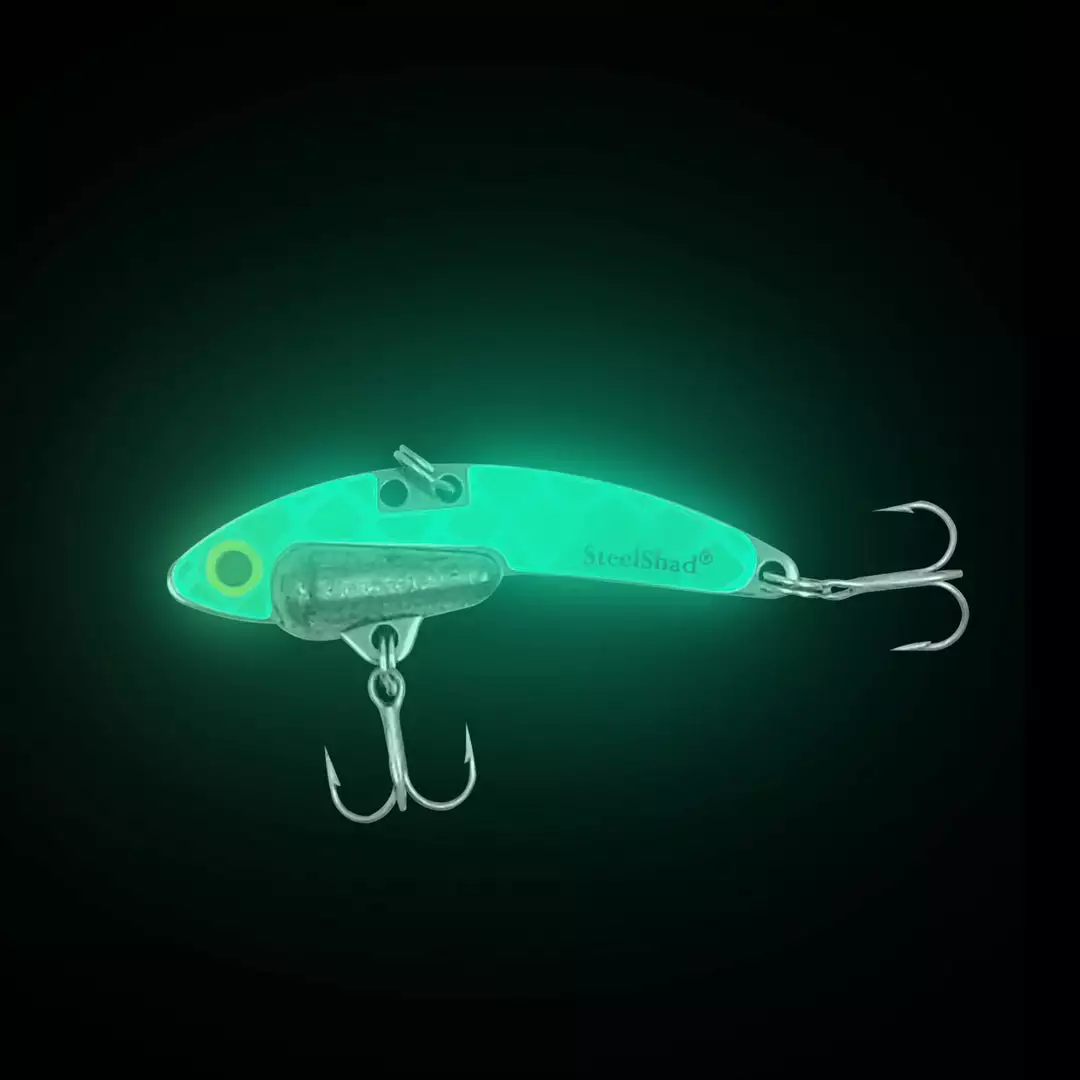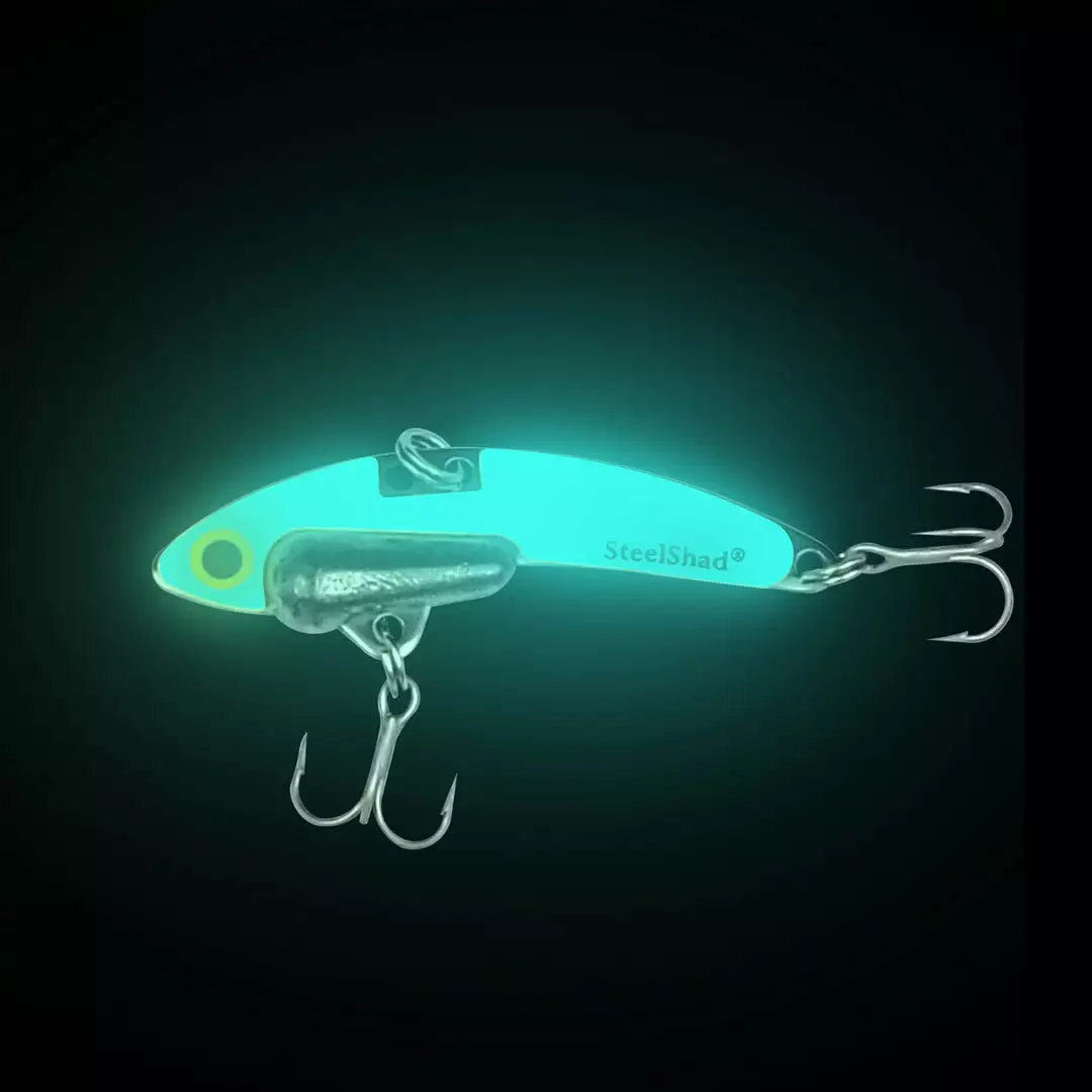 The SteelShad® Mini 1/4 oz. blade bait is 1 3/4 inches long, made from durable stainless steel with a molded lead weight, and feature two #12 VMC Permasteel hooks that are coated for both fresh and salt water fishing. SteelShad’s glow effect is instantly charged by sunlight or any other light source. During the day, each lift of your rod will allow the natural sunlight to provide a long lasting luminescent charge to keep the lures glowing below the waters surface. During low light or nighttime conditions, the quick use of a flashlight can be used to recharge the lures between casts.