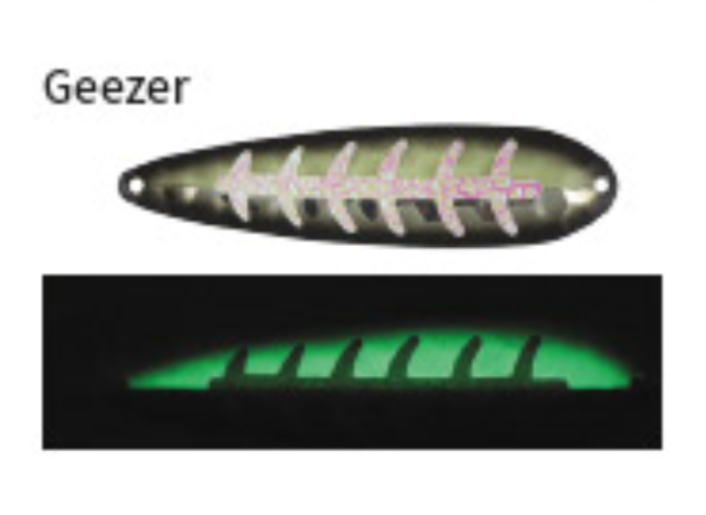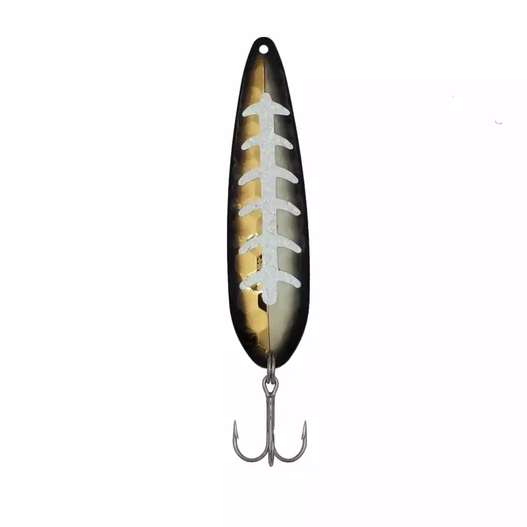 The Moonshine Half Moon Spoon is a hand painted, UV reflective spoon designed to attract salmon, steelhead, trout, pike and many other species. The silver back delivers eye-catching flashes that fish can’t resist.Â