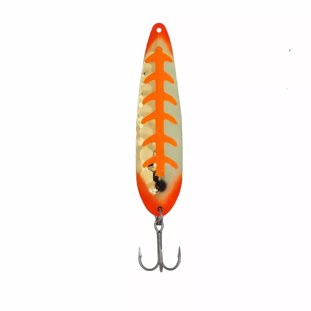 The Moonshine Half Moon Spoon is a hand painted, UV reflective spoon designed to attract salmon, steelhead, trout, pike and many other species. The silver back delivers eye-catching flashes that fish can’t resist.Â