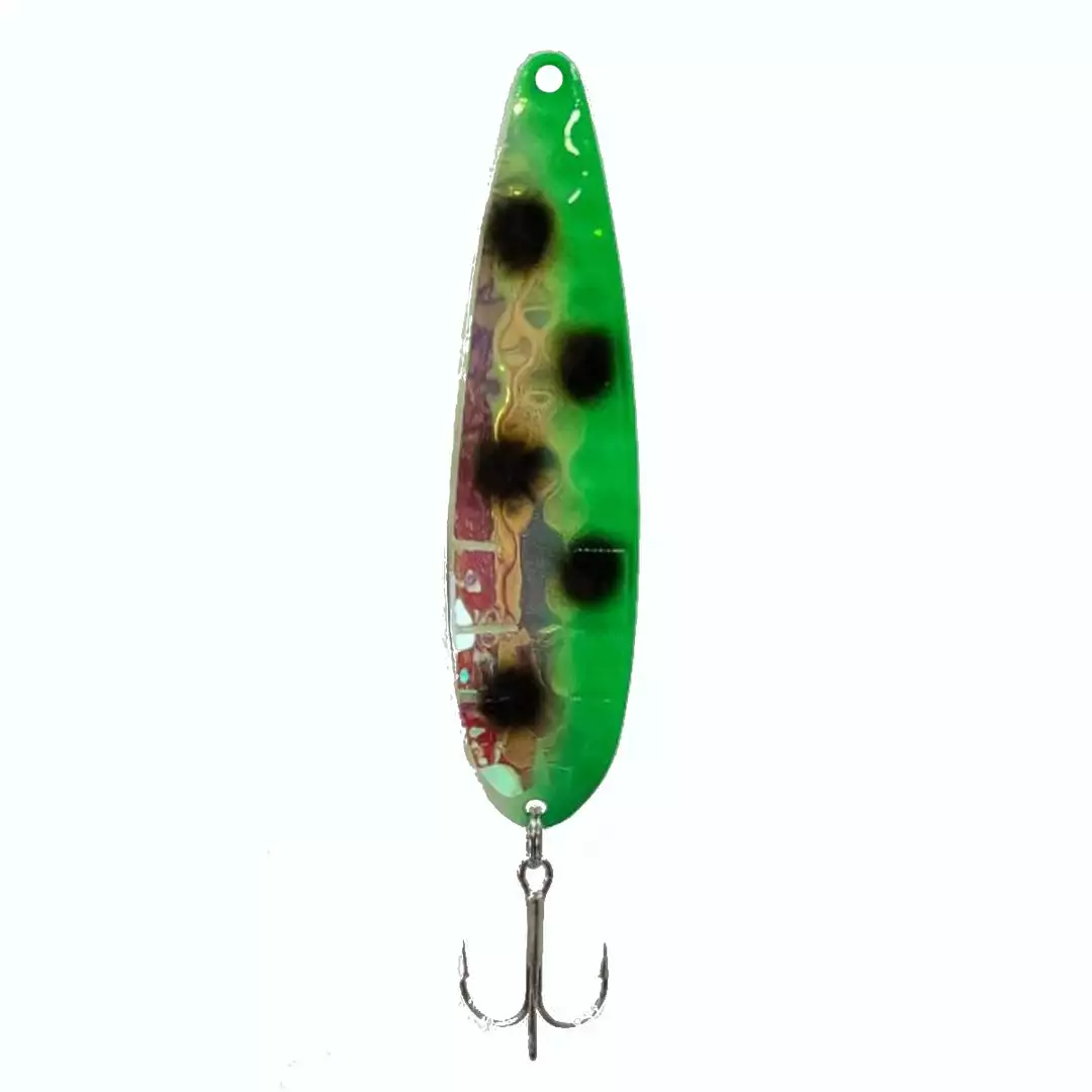 The Moonshine RV Spoon is a hand painted, UV reflective spoon designed to attract salmon, steelhead, trout, pike and many other species. The silver back delivers eye-catching flashes that fish can’t resist.